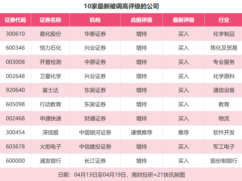 评级调高方面,4月13日至4月19日,券商调高上市公司评级达到11家次,最新数据包括了华泰证券对晨化股份的评级从“增持”调高至“买入”,兴业证券对恒力石化的评级从“增持”调高至“买入”,中原证券对开普检测的评级从“增持”调高至“买入”。