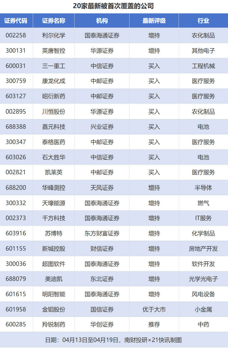 首次覆盖方面,4月13日至4月19日券商共给出了83次首次覆盖,其中利尔化学获得国泰海通证券给予“增持”评级,英唐智控获得华源证券给予“增持”评级,三一重工获得中信证券给予“买入”评级,康龙化成、昭衍新药获得中邮证券给予“买入”评级。