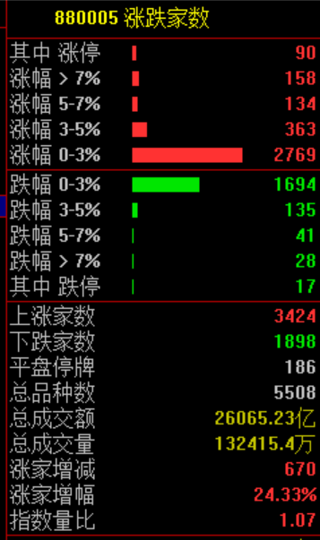 市场共3424只个股上涨,90只个股涨停,1898只个股下跌。