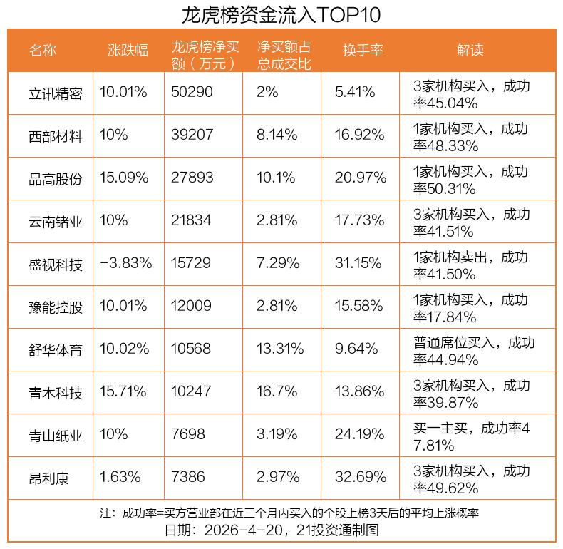 4月20日,上证指数上涨0.76%,深证成指上涨0.55%,创业板指下跌0.02%。盘后龙虎榜数据显示,共有48只个股因当日异动登上龙虎榜,资金净流入最多的是立讯精密(002475.SZ),达5.03亿元。