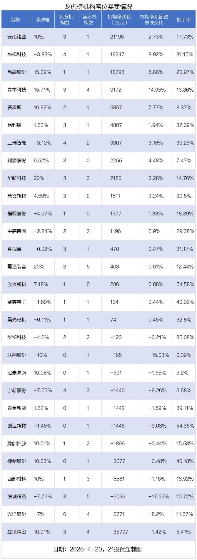 其中,机构净买入金额最多的是云南锗业(002428.SZ),当日收盘上涨10%,换手率为17.73%。