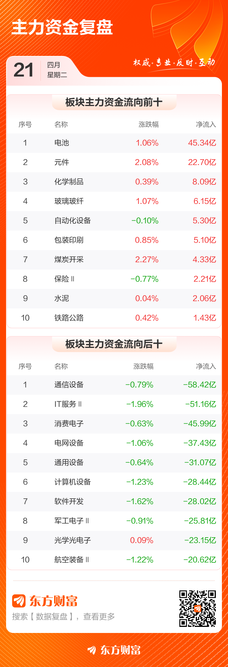 4月21日,沪指涨0.07%,深成指涨0.1%,创业板指涨0.31%。两市成交额2.41万亿,较上个交易日缩量1702亿。数据显示,今日大盘主力资金净流出532.23亿。电池、元件、化学制品等板块主力资金流入排名居前,其中电池净流入45.34亿元。