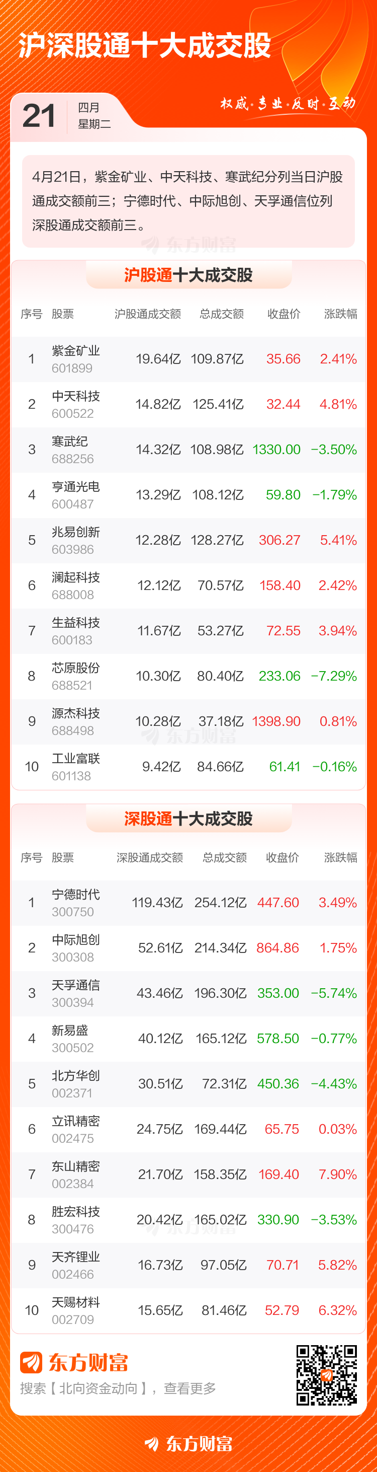 紫金矿业、中天科技、寒武纪位列沪股通成交前三,成交额分别为19.64亿、14.82亿、14.32亿;宁德时代、中际旭创、天孚通信位列深股通成交前三,成交额分别为119.43亿、52.61亿、43.46亿。