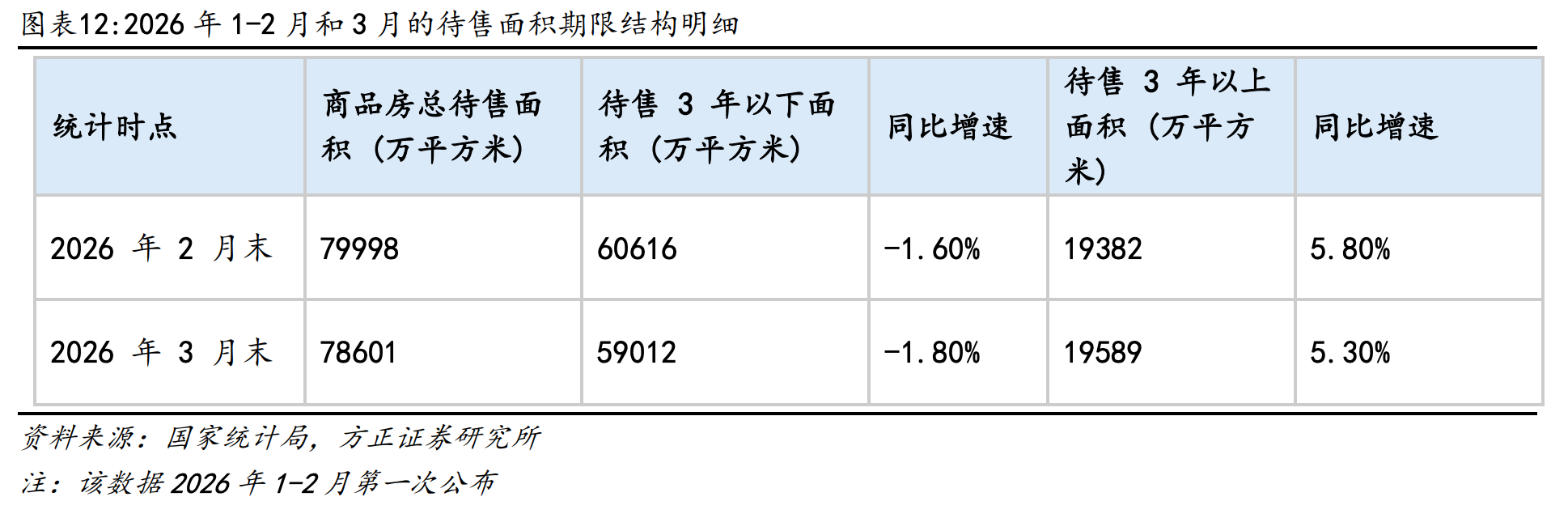 方正证券研报指出,截至3月末,待售3年以下的面积为59012万平方米,同比下降1.8%,降幅较2月末扩大0.2个百分点,说明2022年以来累积的市场新增库存正被逐步消化。分物业类型看,商业营业用房待售面积同比下降5.8%,去化效果最为显著;住宅待售面积虽然同比仍增长1.4%,但环比2月末减少981万平方米,也呈现出明确的改善趋势。