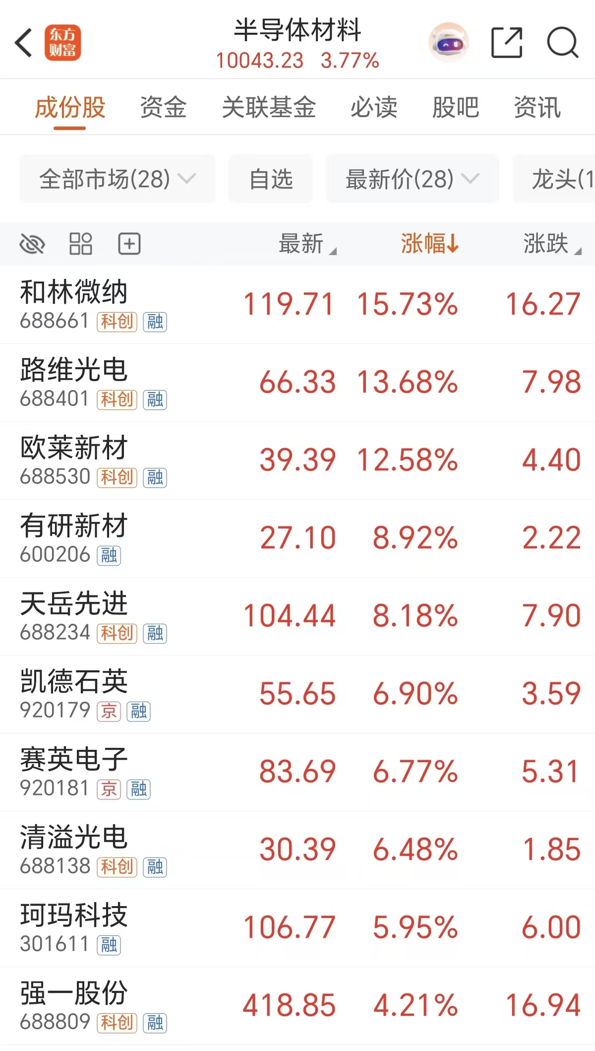 周三半导体材料概念股持续活跃,光掩膜版、溅射靶材方向领涨,截至午间收盘,和林微纳、路维光电等涨超10%,有研新材、天岳先进等强势跟涨。