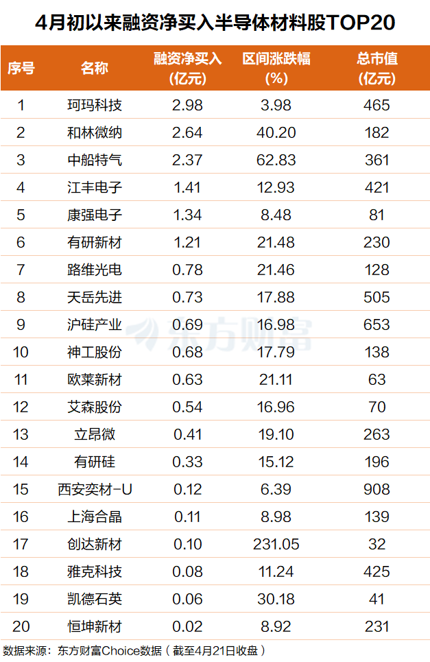 东方财富Choice数据显示,自今年4月以来,杠杆资金也净买入了一批半导体材料个股。其中珂玛科技排名第一,融资净买额近3亿元;和林微纳排名第二,融资净买额超2.6亿元。