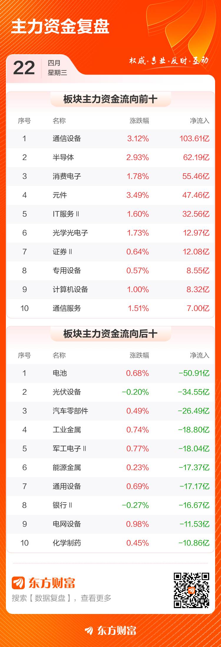 4月22日,沪指涨0.52%,深成指涨1.3%,创业板指涨1.73%。两市成交额2.56万亿,较上个交易日放量1512亿。数据显示,今日大盘主力资金净流出69.22亿。通信设备、半导体、消费电子等板块主力资金流入排名居前,其中通信设备净流入103.61亿元。