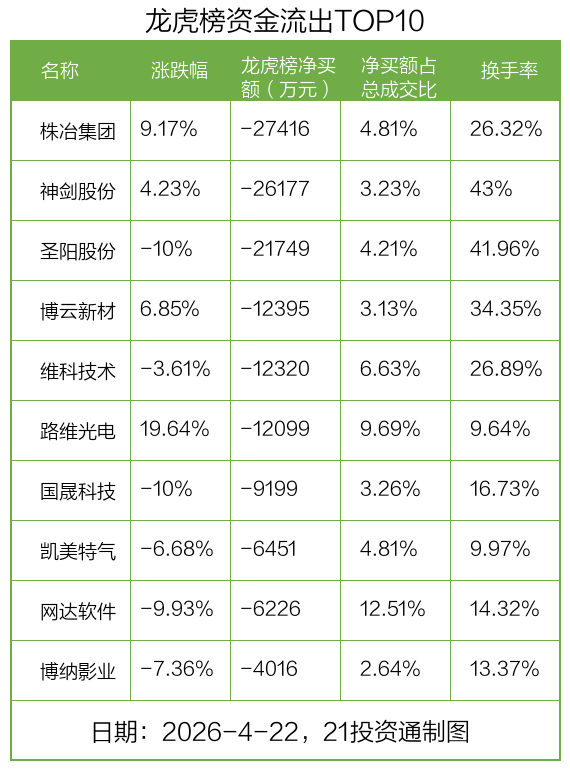 4月22日,上证指数上涨0.52%,深证成指上涨1.3%,创业板指上涨1.73%。盘后龙虎榜数据显示,共有51只个股因当日异动登上龙虎榜,资金净流入最多的是协创数据(300857.SZ),达4.27亿元。