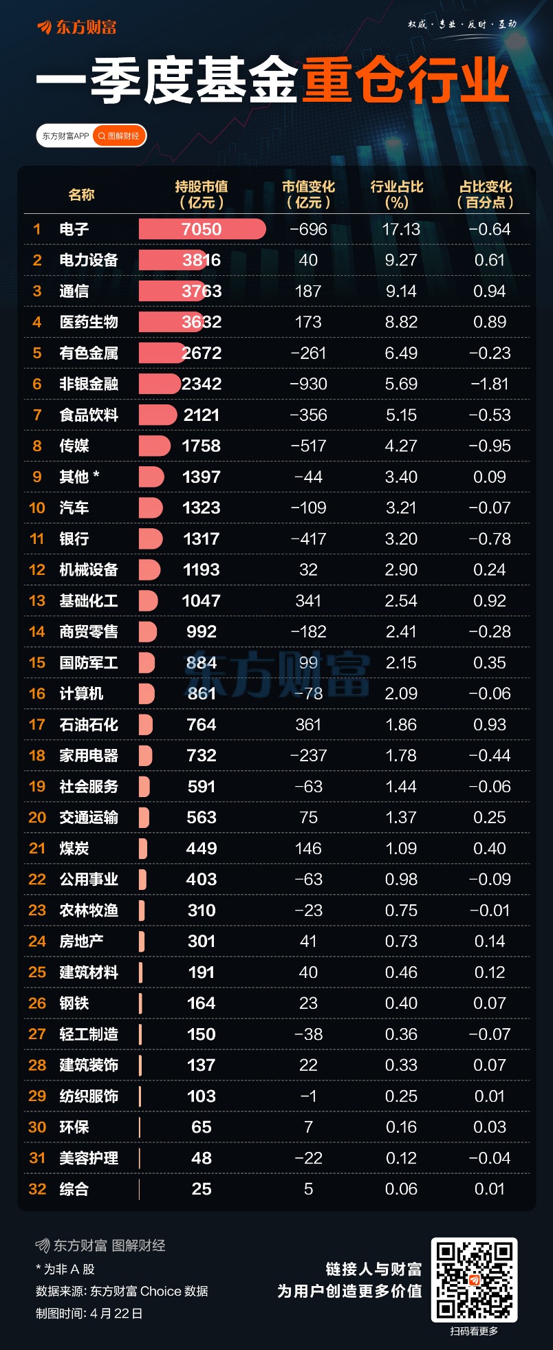 持仓市值变化方面,石油石化和基础化工市值增加最多,分别增加361亿元和341亿元,同期行业指数涨幅15.36%和6.90%。如果从行业占比变化来看,通信行业占比较去年四季度增长0.94个百分点,超过了石油石化的0.93个百分点和基础化工的0.92个百分点。
