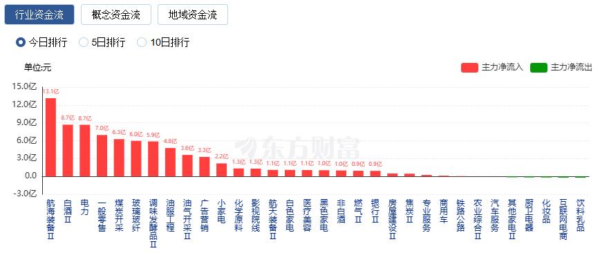 行业资金方面,截至收盘,航海设备、白酒、电力等净流入排名靠前,其中航海设备净流入13.14亿。