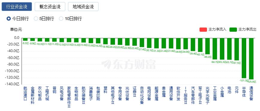 净流出方面,通信设备、半导体、元件等净流出排名靠前,其中通信设备净流出125.0亿元。