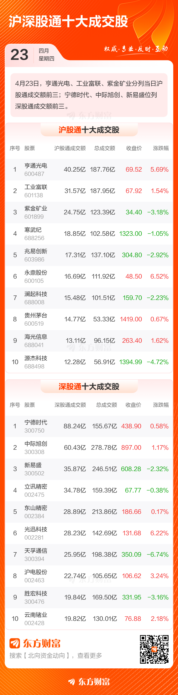 亨通光电、工业富联、紫金矿业位列沪股通成交前三,成交额分别为40.25亿、31.57亿、24.75亿;宁德时代、中际旭创、新易盛位列深股通成交前三,成交额分别为88.24亿、60.43亿、35.87亿。