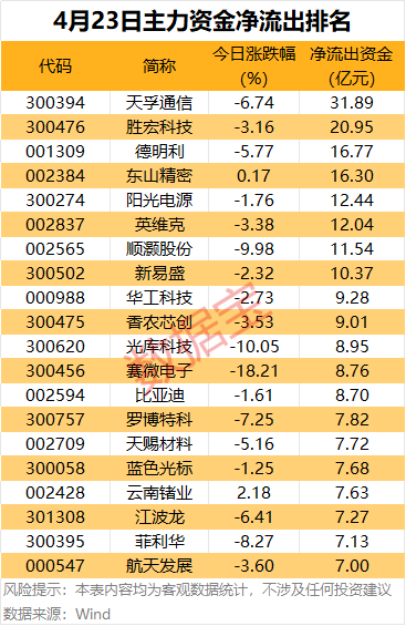 据数据宝统计,今日有105股主力资金净流出均超2亿元,其中,天孚通信、胜宏科技、德明利、东山精密、阳光电源、英维克、顺灏股份、新易盛净流出金额居前,均超10亿元。