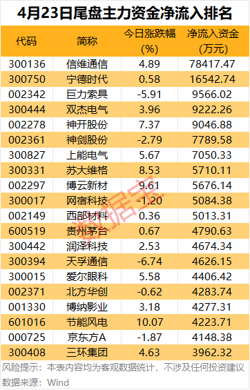 个股方面,信维通信、宁德时代尾盘主力资金净流入金额分别为7.84亿元、1.65亿元。