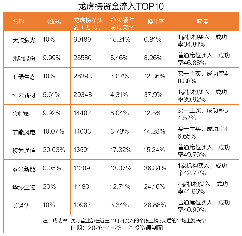 4月23日,上证指数下跌0.32%,深证成指下跌0.88%,创业板指下跌0.87%。盘后龙虎榜数据显示,共有56只个股因当日异动登上龙虎榜,资金净流入最多的是大族激光(002008.SZ),达9.92亿元。