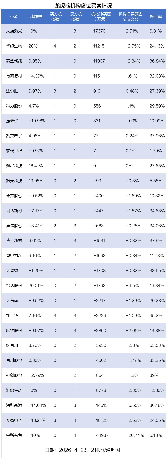 4月23日,28只个股龙虎榜出现了机构的身影,机构合计净卖出7.63亿元。具体来看,机构净买入10股,净卖出18股。