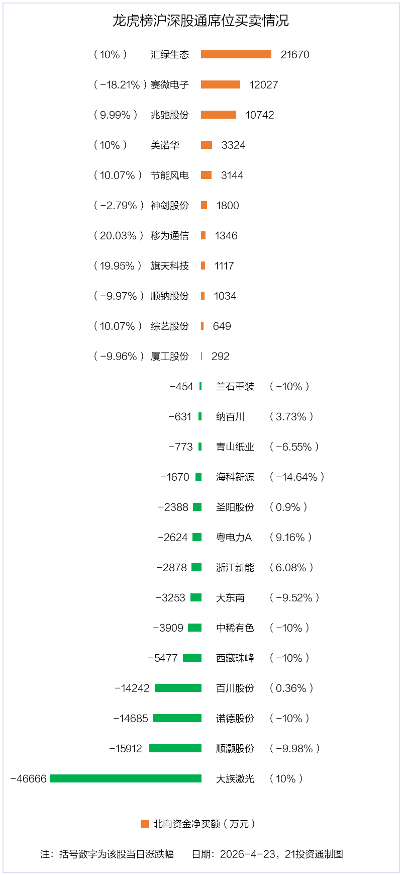 4月23日,北向资金参与龙虎榜中的个股共有25只,合计净卖出5.84亿元。其中沪股通净买入4股,净卖出6股,合计净卖出2.08亿元;深股通净买入7股,净卖出8股,合计净卖出3.76亿元。