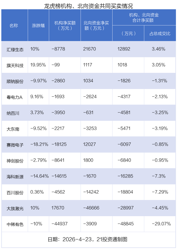 值得注意的是,机构和北向资金共同净卖出了纳百川、海科新源、粤电力A、大东南、中稀有色、百川股份等6股;在汇绿生态、赛微电子、神剑股份、旗天科技、顺钠股份、大族激光上出现分歧,机构净卖出汇绿生态8777.9万元,北向资金净买入2.17亿元;机构净卖出赛微电子1.81亿元,北向资金净买入1.2亿元;机构净卖出神剑股份8640.87万元,北向资金净买入1800.46万元;机构净卖出旗天科技98.98万元,北向资金净买入1117.48万元;机构净卖出顺钠股份2860.01万元,北向资金净买入1034.05万元;机构净买入大族激光1.77亿元,北向资金净卖出4.67亿元。