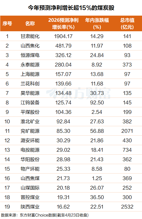 恒源煤电、永泰能源、上海能源、兰花科创、昊华能源、江钨装备、平煤股份等个股机构预测净利增长率在3.3倍至1倍之间不等。