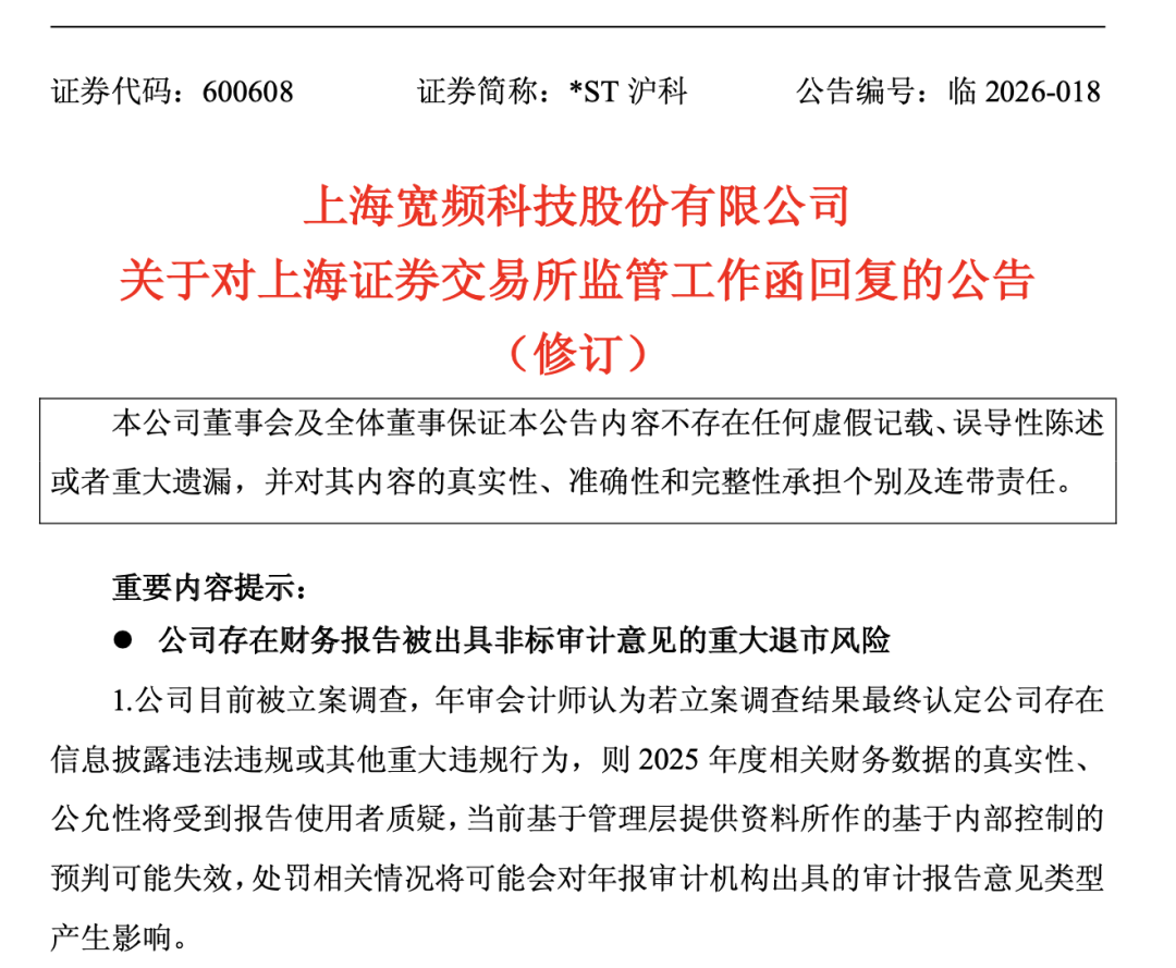 *ST沪科则面临财务类退市及非标审计意见退市的重大风险。据公司4月3日披露的对上交所监管工作函回复的公告,公司花卉经纪代理服务、运输代理服务、品牌宣传服务三项业务的商业实质、对关联方独立性、可持续性均存在重大疑点,公司部分业务供应商与客户存在关联关系。若截至审计报告日,年审会计师无法取得充分、适当审计证据,可能会对公司2025年年报出具非标审计意见。