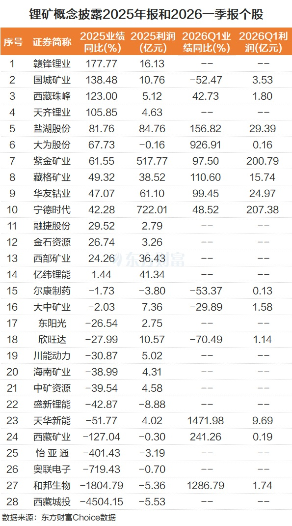 东方财富Choice数据显示,当前锂矿板块中有28股披露了2025年报或2026年一季报。从2025年报来看,赣锋锂业、国城矿业、西藏珠峰、天齐锂业2025年归母净利润同比翻倍;宁德时代、紫金矿业、盐湖股份、华友钴业、藏格矿业、西部矿业2025年业绩也明显增长。尤其宁德时代,2025年营收净利润均创历史新高。