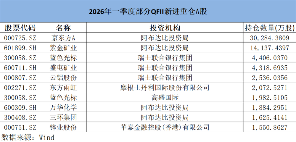 需关注的是,一季度有400多笔外资机构“新进”持仓。从持股数量看,阿布达比投资局大手笔买入的京东方A、紫金矿业位居QFII一季度新进持股的前两位,持股数分别为3.03亿股、1.41亿股;此外,QFII新进持仓的蓝色光标、盛屯矿业、云铝股份、东方雨虹、万华化学、三环集团、锌业股份等位居持有量前列。