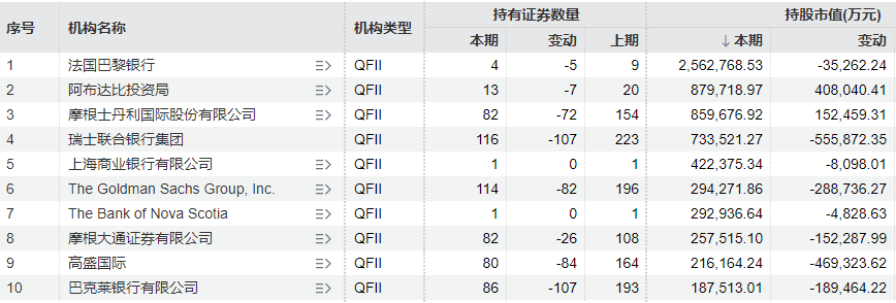 聚焦QFII机构来看,法国巴黎银行一季度末以256.28亿元的持有市值位居榜首;阿布达比投资局、摩根士丹利持有市值分别为87.97亿元、85.97亿元,分列二三。