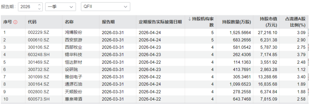 个股层面,鸿博股份、西安旅游同时被5家QFII持有,成为目前一季度持股QFII家数最多的个股。其中,持有鸿博股份的有瑞士联合银行集团、摩根大通证券、摩根士丹利、中信证券资产管理(香港)有限公司-客户资金、高盛国际;持有西安旅游的有摩根大通证券、美林证券、巴克莱银行、摩根士丹利、瑞士联合银行集团等。