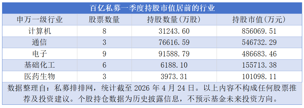 从百亿私募一季度持股市值前十的A股来看,电子行业个股有3只,计算机行业和通信行业个股各有2只,科技股合计达7只。