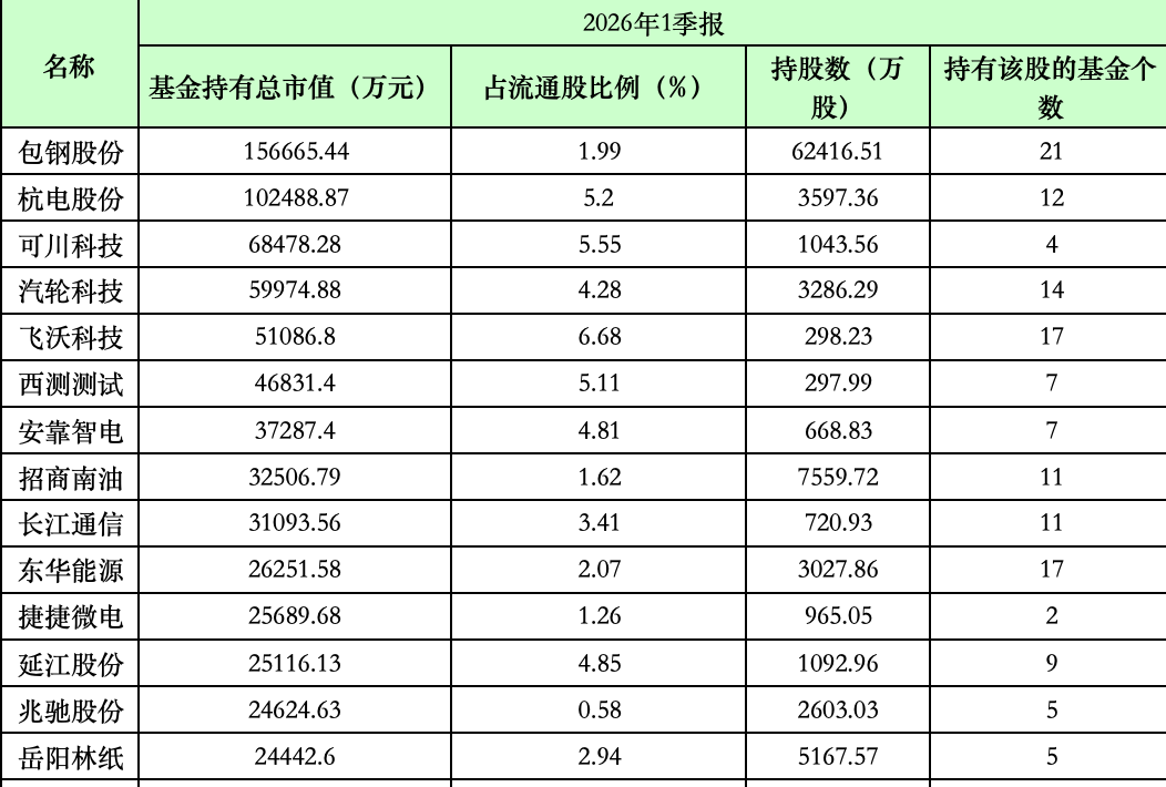 例如,包钢股份、万凯新材分别被21只主动偏股基金新进重仓;东华能源、汽轮科技、电科蓝天分别被17只、14只、12只主动偏股基金新进重仓。
