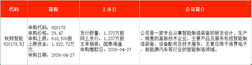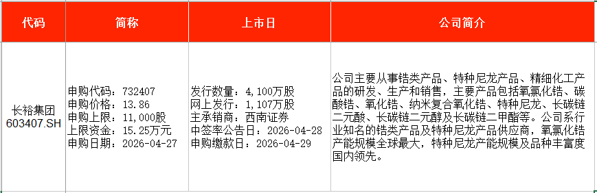 从时间表看,长裕集团(603407)、锐翔智能(920178)均在本周一(4月27日)申购。