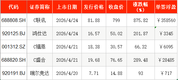 值得一提的是,上周登陆科创板的联讯仪器(688808),上市首日单签浮盈达到35.85万元,创下A股首日单签收盘浮盈的次高,仅次于2025年上市的沐曦股份(688802)。