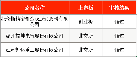 其中,拟在创业板IPO的托伦斯精密制造(江苏)股份有限公司(下称“托伦斯”),以及拟在北交所IPO的温州益坤电气股份有限公司(下称“益坤电气”)、江苏凯达重工股份有限公司(下称“凯达重工”)等,均成功过会。