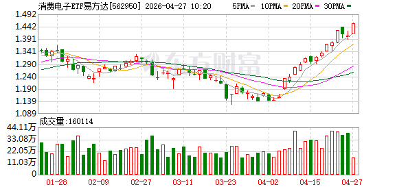 截至2026年4月27日 09:31,中证消费电子主题指数(931494)强势上涨2.15%,消费电子ETF平安(561600)上涨2.07%,最新价报1.38元。