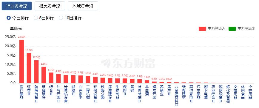 行业资金方面,截至收盘,医疗服务、证券、航海装备等净流入排名靠前,其中医疗服务净流入23.50亿。