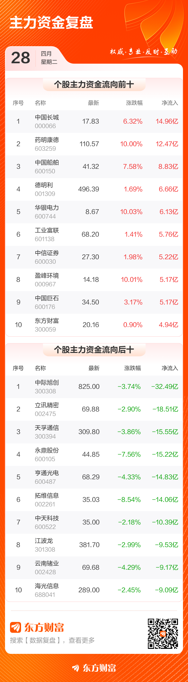 主力复盘:14.96亿抢筹中国长城 32.49亿流出中际旭创.