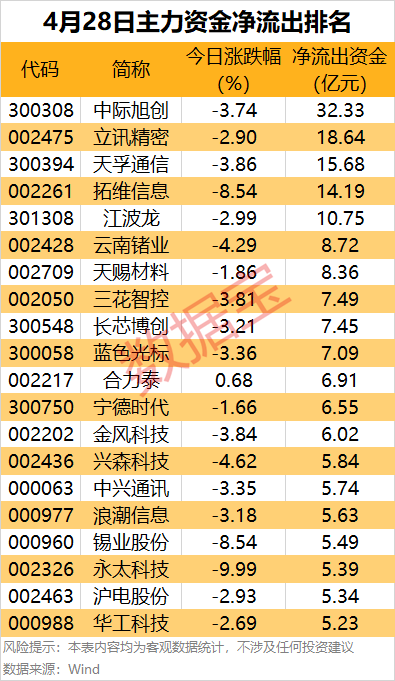 中际旭创主力资金净流出32.33亿元,居首;立讯精密、天孚通信、拓维信息、江波龙、云南锗业、天赐材料等热门股主力资金净流出金额居前。