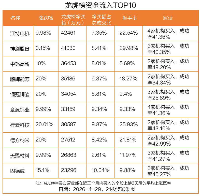 4月29日,上证指数上涨0.71%,深证成指上涨1.96%,创业板指上涨2.52%。盘后龙虎榜数据显示,共有60只个股因当日异动登上龙虎榜,资金净流入最多的是江特电机(002176.SZ),达4.25亿元。