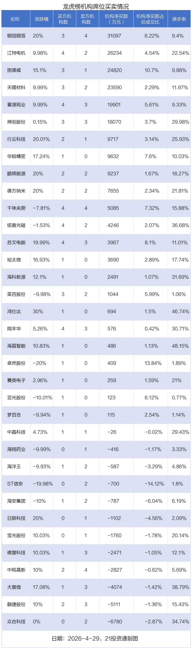 4.25亿资金抢筹江特电机,机构狂买铜冠铜箔丨龙虎榜