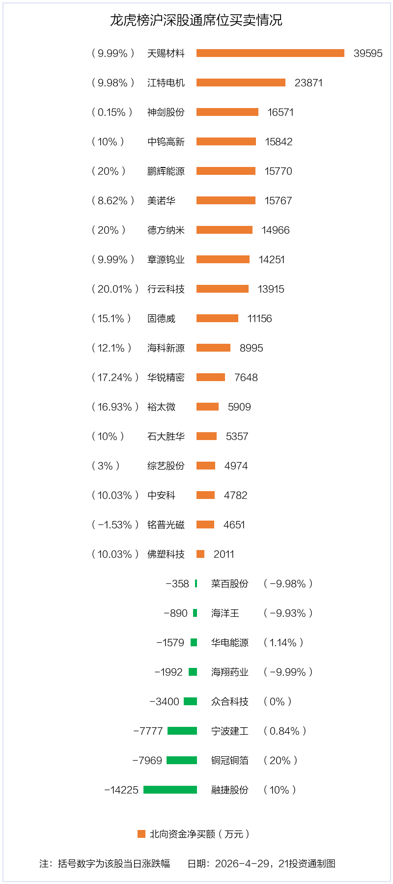 4月29日,北向资金参与龙虎榜中的个股共有26只,合计净买入18.78亿元。其中沪股通净买入7 股,净卖出3 股,合计净买入4.59亿元;深股通净买入11 股,净卖出5 股,合计净买入14.2亿元。