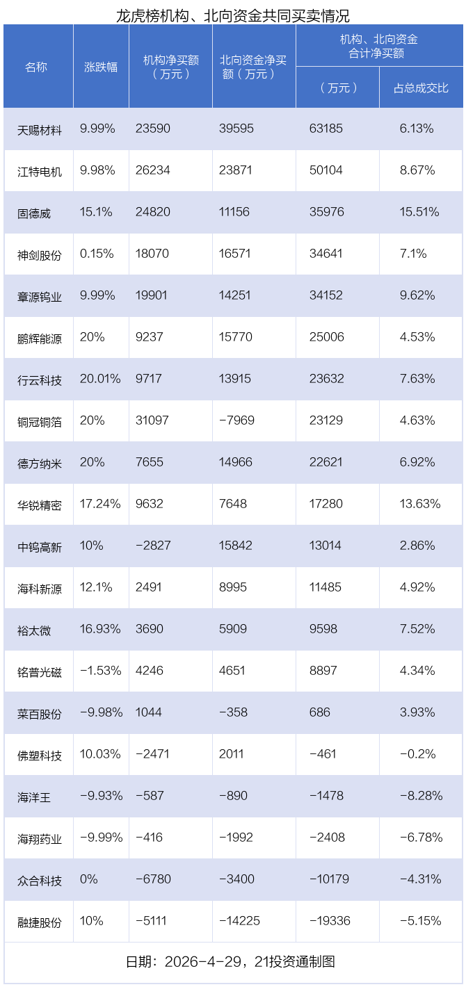 据21投资通智能监测,35只个股龙虎榜出现了机构的身影,北向资金参与龙虎榜中的个股共涉及26只。