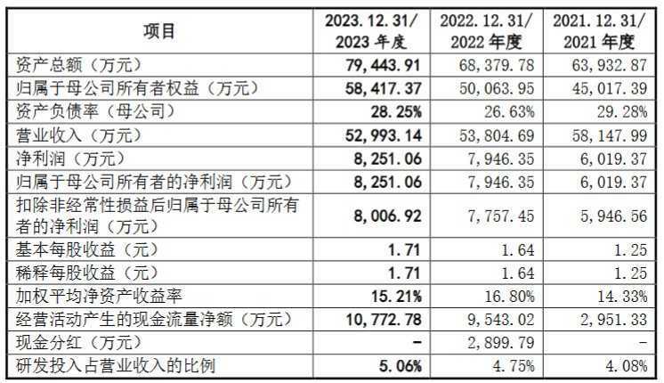 财务方面,于2021年、2022年、2023年,公司实现营业收入分别约为5.81亿元、5.38亿元、5.30亿元,同期,实现净利润分别约为6019.37万元、7946.35万元、8251.06万元。