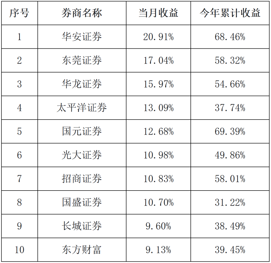 复盘9月各券商金股组合表现,每市科技数据显示,10家券商金股组合9月收益超过9%。其中,华安证券的金股组合以20.91%的当月收益排名第一;东莞证券9月金股表现也可圈可点,以17.04%的收益排在第二;华龙证券、太平洋证券、国元证券等券商紧随其后。