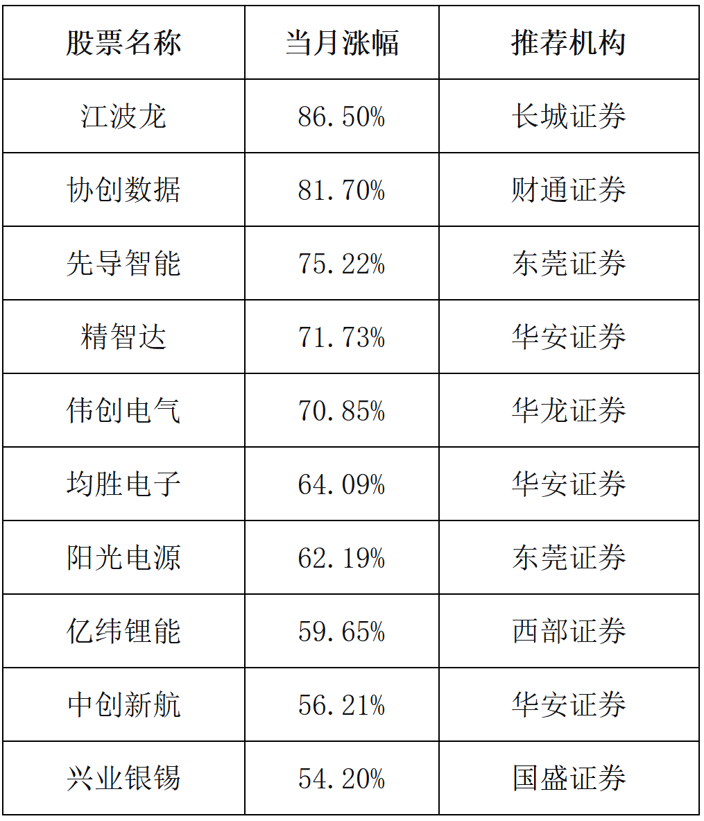 在9月金股中,长城证券推荐的江波龙当月上涨了86.5%,涨幅居于当月金股榜首;财通证券推荐的协创数据9月涨幅达到81.7%,排名第二;东莞证券推荐的先导智能以75.22%的月涨幅位居第三。这些个股的突出表现印证了券商选股的前瞻性。