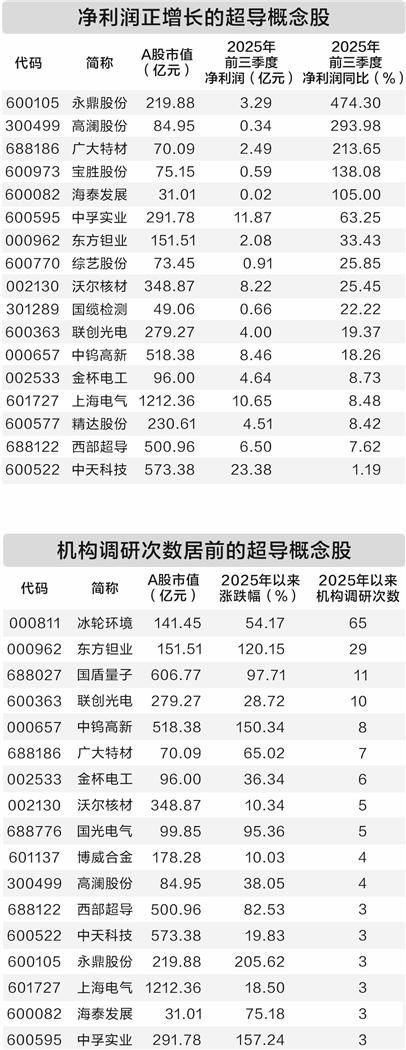 业绩数据方面,今年前三季度净利润同比增长(含扭亏为盈)的超导概念股有17只。永鼎股份、高澜股份、广大特材、宝胜股份、海泰发展等净利润增速相对靠前。永鼎股份今年前三季度实现净利润3.29亿元,同比增长474.3%;报告期内,公司对联营企业权益法确认的投资收益达到3.17亿元。