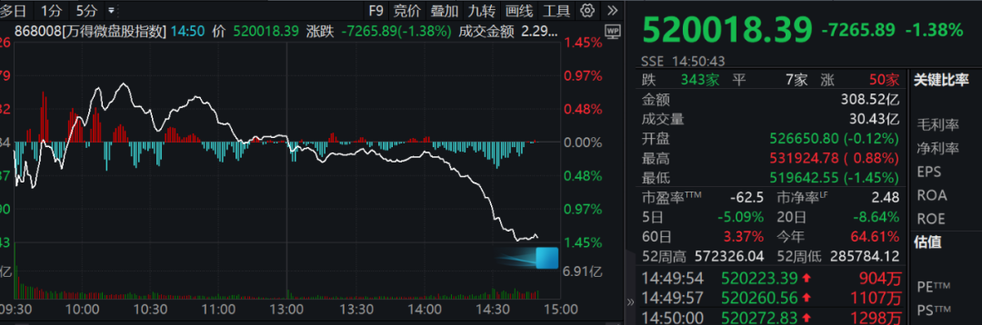 午后,A股市场一度冲高。但微盘股在下午两点过后也开启了显著杀跌之旅。微盘股指数一度杀跌超1.4%。不少上午存有一定涨幅的中小盘个股午后皆出现显著杀跌。