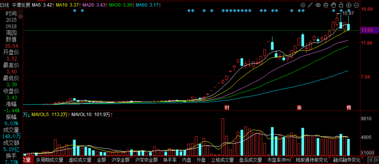 平潭发展2025年下半年再一次平地起飞,股价从2025年8月4日的最低每股2.93元,一路上涨至2025年12月17日的最高16.97元,涨幅为479.18%,接近上涨5倍。