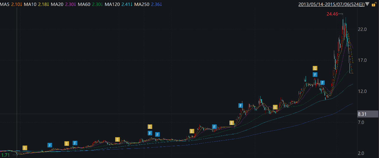 2013—2015年,平潭发展从最低每股1.71元狂涨至24.46元。
