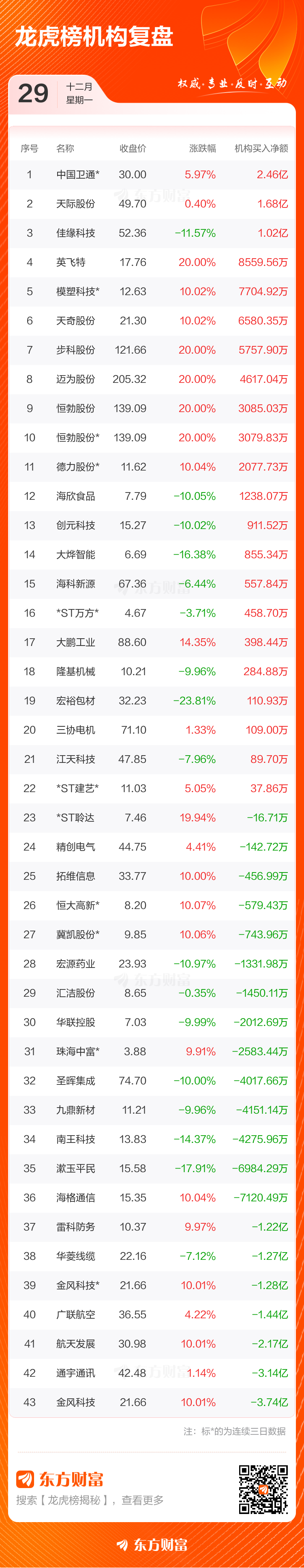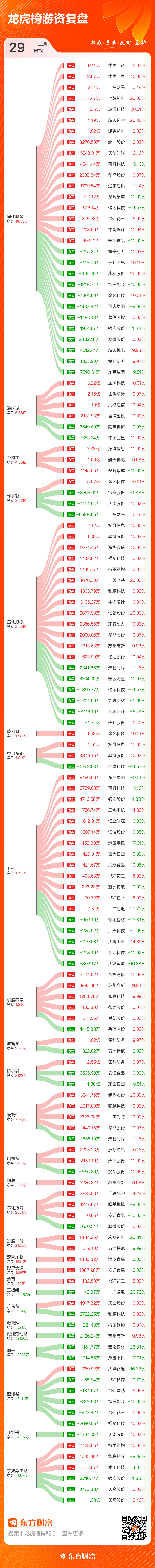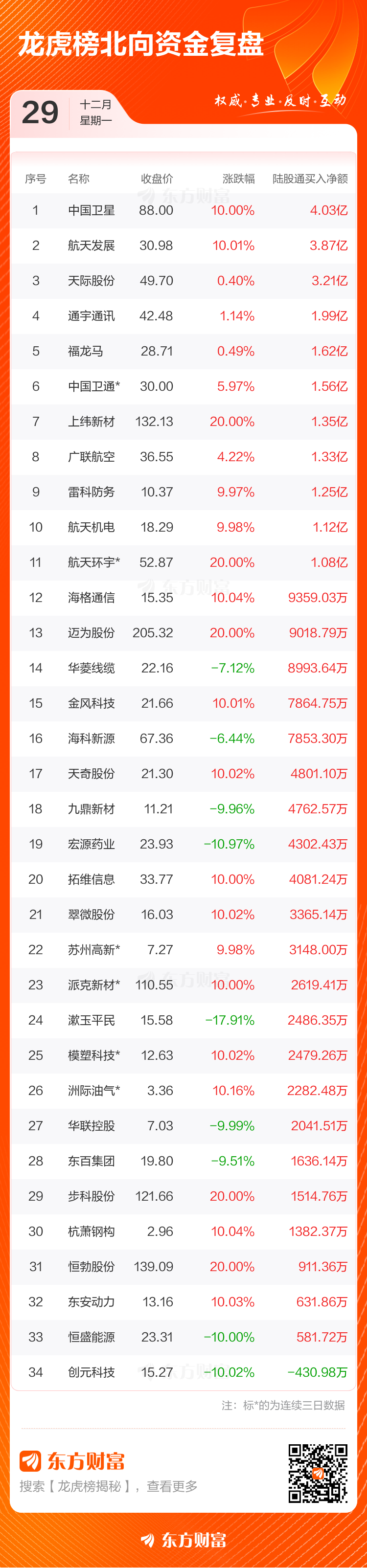 12月29日共有76只个股上榜龙虎榜,总上榜成交额295.97亿元。上榜个股中净买入额最高的是金风科技,金额为8.85亿元。