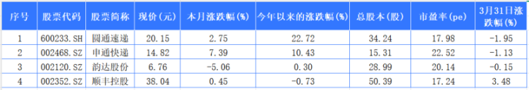 另外,港股的中通快递3月31日报收188.200元港币,3月涨幅为-2%,今年以来涨幅16%。